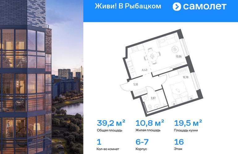 Предлагается 1-комнатная квартира комфорт-класса 39,24 кв.м в корпусе 6-7 на 16 этаже, в ЖК «Живи! В Рыбацком» Квартира без отделки. Доступность опции «отделка» и возможность комплектации мебелью и декором уточняйте у застройщика. Приобрести квартиру возможно по специальным акциям от застройщика, с текущими условиями акций можно ознакомиться в блоке «Акций». Цена динамическая и может отличаться, уточняйте актуальность у застройщика. Квартал «Живи! В Рыбацком» в Невском районе Санкт-Петербурга расположен рядом с рекой Славянкой и парком. Всего 20 минут пешей прогулки — и вы у метро «Рыбацкое». Автомобилисты будут добираться до КАДа за десять минут. В квартале работают два детских сада, школа и кабинет врача. На первых этажах зданий открыты магазины, кафе и салоны красоты. Во дворе — зеленые бульвары, воркаут-площадка, спортивный и игровой кластеры. Для машин — подземный паркинг. Кирпично-монолитные дома с каменной облицовкой — воплощение долговечности и тепла. Есть в квартале и камерный 30-й корпус, в нем восемь этажей, 70 квартир и приватный двор-парк. В сквозных парадных — безбарьерная среда, помещения для хранения колясок и велосипедов и система видеонаблюдения. #yan19-2r1804481#О застройщике