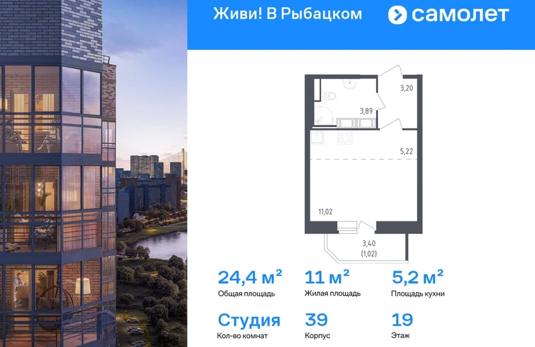 Предлагается квартира студия комфорт-класса 24,35 кв.м в корпусе 39 на 19 этаже, в ЖК «Живи! В Рыбацком» Квартира с предчистовой отделкой. Доступность дополнительных опций уточняйте у застройщика. Приобрести квартиру возможно по специальным акциям от застройщика, с текущими условиями акций можно ознакомиться в блоке «Акций». Цена динамическая и может отличаться, уточняйте актуальность у застройщика. Квартал «Живи! В Рыбацком» в Невском районе Санкт-Петербурга расположен рядом с рекой Славянкой и парком. Всего 20 минут пешей прогулки — и вы у метро «Рыбацкое». Автомобилисты будут добираться до КАДа за десять минут. В квартале работают два детских сада, школа и кабинет врача. На первых этажах зданий открыты магазины, кафе и салоны красоты. Во дворе — зеленые бульвары, воркаут-площадка, спортивный и игровой кластеры. Для машин — подземный паркинг. Кирпично-монолитные дома с каменной облицовкой — воплощение долговечности и тепла. Есть в квартале и камерный 30-й корпус, в нем восемь этажей, 70 квартир и приватный двор-парк. В сквозных парадных — безбарьерная среда, помещения для хранения колясок и велосипедов и система видеонаблюдения. #yan19-2r1804494#О застройщике