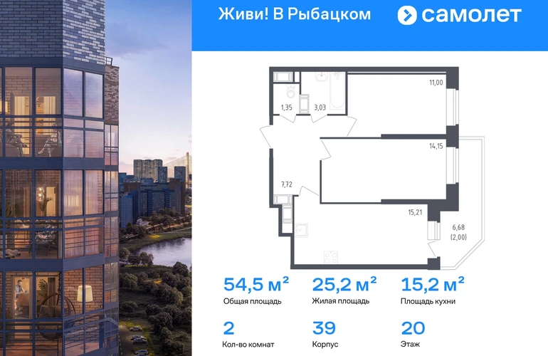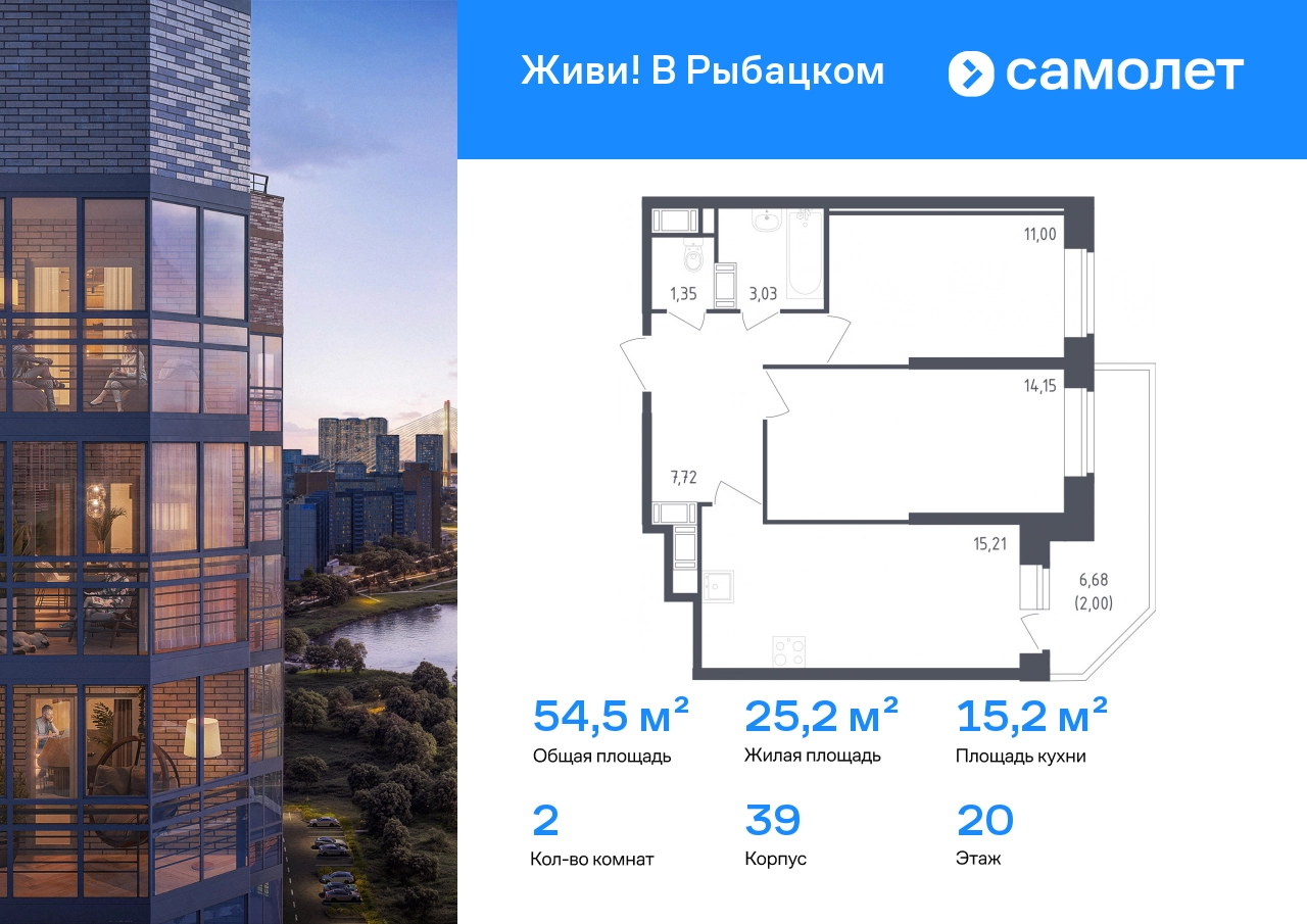 Предлагается 2-комнатная квартира комфорт-класса 54,46 кв.м в корпусе 39 на 20 этаже, в ЖК «Живи! В Рыбацком» Квартира с предчистовой отделкой. Доступность дополнительных опций уточняйте у застройщика. Приобрести квартиру возможно по специальным акциям от застройщика, с текущими условиями акций можно ознакомиться в блоке «Акций». Цена динамическая и может отличаться, уточняйте актуальность у застройщика. Квартал «Живи! В Рыбацком» в Невском районе Санкт-Петербурга расположен рядом с рекой Славянкой и парком. Всего 20 минут пешей прогулки — и вы у метро «Рыбацкое». Автомобилисты будут добираться до КАДа за десять минут. В квартале работают два детских сада, школа и кабинет врача. На первых этажах зданий открыты магазины, кафе и салоны красоты. Во дворе — зеленые бульвары, воркаут-площадка, спортивный и игровой кластеры. Для машин — подземный паркинг. Кирпично-монолитные дома с каменной облицовкой — воплощение долговечности и тепла. Есть в квартале и камерный 30-й корпус, в нем восемь этажей, 70 квартир и приватный двор-парк. В сквозных парадных — безбарьерная среда, помещения для хранения колясок и велосипедов и система видеонаблюдения. #yan19-2r1805474#О застройщике