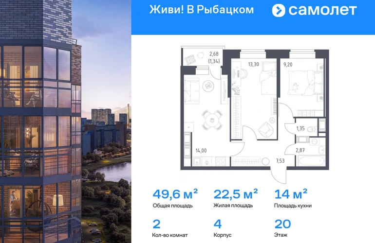Предлагается 2-комнатная квартира комфорт-класса 49,59 кв.м в корпусе 4 на 20 этаже, в ЖК «Живи! В Рыбацком» Квартира с чистовой отделкой. Доступность дополнительных опций уточняйте у застройщика. Приобрести квартиру возможно по специальным акциям от застройщика, с текущими условиями акций можно ознакомиться в блоке «Акций». Цена динамическая и может отличаться, уточняйте актуальность у застройщика. Квартал «Живи! В Рыбацком» в Невском районе Санкт-Петербурга расположен рядом с рекой Славянкой и парком. Всего 20 минут пешей прогулки — и вы у метро «Рыбацкое». Автомобилисты будут добираться до КАДа за десять минут. В квартале работают два детских сада, школа и кабинет врача. На первых этажах зданий открыты магазины, кафе и салоны красоты. Во дворе — зеленые бульвары, воркаут-площадка, спортивный и игровой кластеры. Для машин — подземный паркинг. Кирпично-монолитные дома с каменной облицовкой — воплощение долговечности и тепла. Есть в квартале и камерный 30-й корпус, в нем восемь этажей, 70 квартир и приватный двор-парк. В сквозных парадных — безбарьерная среда, помещения для хранения колясок и велосипедов и система видеонаблюдения. #yan19-2r1805962#О застройщике