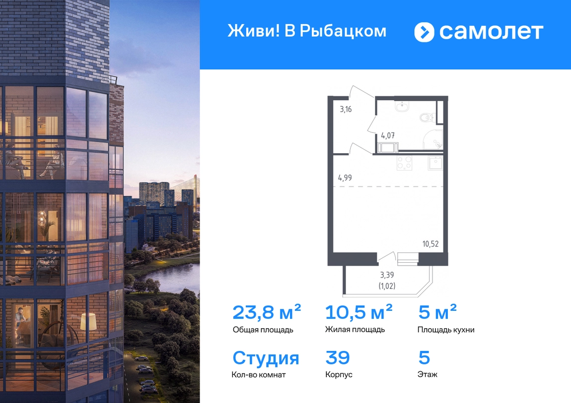 Предлагается квартира студия комфорт-класса 23,76 кв.м в корпусе 39 на 5 этаже, в ЖК «Живи! В Рыбацком» Квартира с чистовой отделкой. Доступность дополнительных опций уточняйте у застройщика. Приобрести квартиру возможно по специальным акциям от застройщика, с текущими условиями акций можно ознакомиться в блоке «Акций». Цена динамическая и может отличаться, уточняйте актуальность у застройщика. Квартал «Живи! В Рыбацком» в Невском районе Санкт-Петербурга расположен рядом с рекой Славянкой и парком. Всего 20 минут пешей прогулки — и вы у метро «Рыбацкое». Автомобилисты будут добираться до КАДа за десять минут. В квартале работают два детских сада, школа и кабинет врача. На первых этажах зданий открыты магазины, кафе и салоны красоты. Во дворе — зеленые бульвары, воркаут-площадка, спортивный и игровой кластеры. Для машин — подземный паркинг. Кирпично-монолитные дома с каменной облицовкой — воплощение долговечности и тепла. Есть в квартале и камерный 30-й корпус, в нем восемь этажей, 70 квартир и приватный двор-парк. В сквозных парадных — безбарьерная среда, помещения для хранения колясок и велосипедов и система видеонаблюдения. #yan19-2r1806003#О застройщике