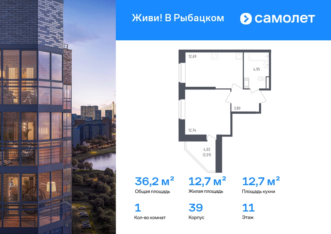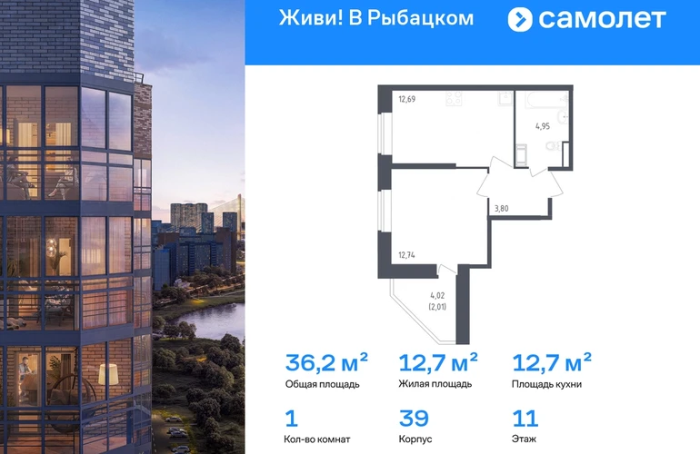 Предлагается 1-комнатная квартира комфорт-класса 36,19 кв.м в корпусе 39 на 11 этаже, в ЖК «Живи! В Рыбацком» Квартира с чистовой отделкой. Доступность дополнительных опций уточняйте у застройщика. Приобрести квартиру возможно по специальным акциям от застройщика, с текущими условиями акций можно ознакомиться в блоке «Акций». Цена динамическая и может отличаться, уточняйте актуальность у застройщика. Квартал «Живи! В Рыбацком» в Невском районе Санкт-Петербурга расположен рядом с рекой Славянкой и парком. Всего 20 минут пешей прогулки — и вы у метро «Рыбацкое». Автомобилисты будут добираться до КАДа за десять минут. В квартале работают два детских сада, школа и кабинет врача. На первых этажах зданий открыты магазины, кафе и салоны красоты. Во дворе — зеленые бульвары, воркаут-площадка, спортивный и игровой кластеры. Для машин — подземный паркинг. Кирпично-монолитные дома с каменной облицовкой — воплощение долговечности и тепла. Есть в квартале и камерный 30-й корпус, в нем восемь этажей, 70 квартир и приватный двор-парк. В сквозных парадных — безбарьерная среда, помещения для хранения колясок и велосипедов и система видеонаблюдения. #yan19-2r1806006#О застройщике