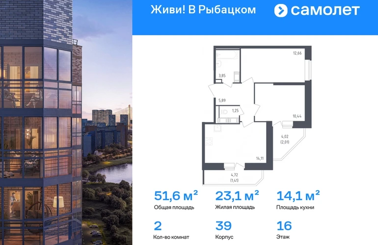 Предлагается 2-комнатная квартира комфорт-класса 51,62 кв.м в корпусе 39 на 16 этаже, в ЖК «Живи! В Рыбацком» Квартира с чистовой отделкой. Доступность дополнительных опций уточняйте у застройщика. Приобрести квартиру возможно по специальным акциям от застройщика, с текущими условиями акций можно ознакомиться в блоке «Акций». Цена динамическая и может отличаться, уточняйте актуальность у застройщика. Квартал «Живи! В Рыбацком» в Невском районе Санкт-Петербурга расположен рядом с рекой Славянкой и парком. Всего 20 минут пешей прогулки — и вы у метро «Рыбацкое». Автомобилисты будут добираться до КАДа за десять минут. В квартале работают два детских сада, школа и кабинет врача. На первых этажах зданий открыты магазины, кафе и салоны красоты. Во дворе — зеленые бульвары, воркаут-площадка, спортивный и игровой кластеры. Для машин — подземный паркинг. Кирпично-монолитные дома с каменной облицовкой — воплощение долговечности и тепла. Есть в квартале и камерный 30-й корпус, в нем восемь этажей, 70 квартир и приватный двор-парк. В сквозных парадных — безбарьерная среда, помещения для хранения колясок и велосипедов и система видеонаблюдения. #yan19-2r1807194#О застройщике