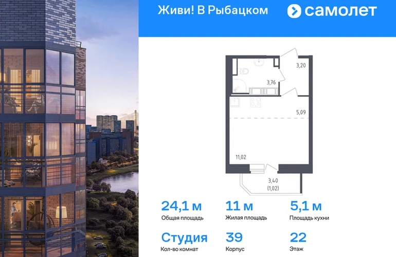 Предлагается квартира студия комфорт-класса 24,09 кв.м в корпусе 39 на 22 этаже, в ЖК «Живи! В Рыбацком» Квартира с предчистовой отделкой. Доступность дополнительных опций уточняйте у застройщика. Приобрести квартиру возможно по специальным акциям от застройщика, с текущими условиями акций можно ознакомиться в блоке «Акций». Цена динамическая и может отличаться, уточняйте актуальность у застройщика. Квартал «Живи! В Рыбацком» в Невском районе Санкт-Петербурга расположен рядом с рекой Славянкой и парком. Всего 20 минут пешей прогулки — и вы у метро «Рыбацкое». Автомобилисты будут добираться до КАДа за десять минут. В квартале работают два детских сада, школа и кабинет врача. На первых этажах зданий открыты магазины, кафе и салоны красоты. Во дворе — зеленые бульвары, воркаут-площадка, спортивный и игровой кластеры. Для машин — подземный паркинг. Кирпично-монолитные дома с каменной облицовкой — воплощение долговечности и тепла. Есть в квартале и камерный 30-й корпус, в нем восемь этажей, 70 квартир и приватный двор-парк. В сквозных парадных — безбарьерная среда, помещения для хранения колясок и велосипедов и система видеонаблюдения. #yan19-2r1808918#О застройщике