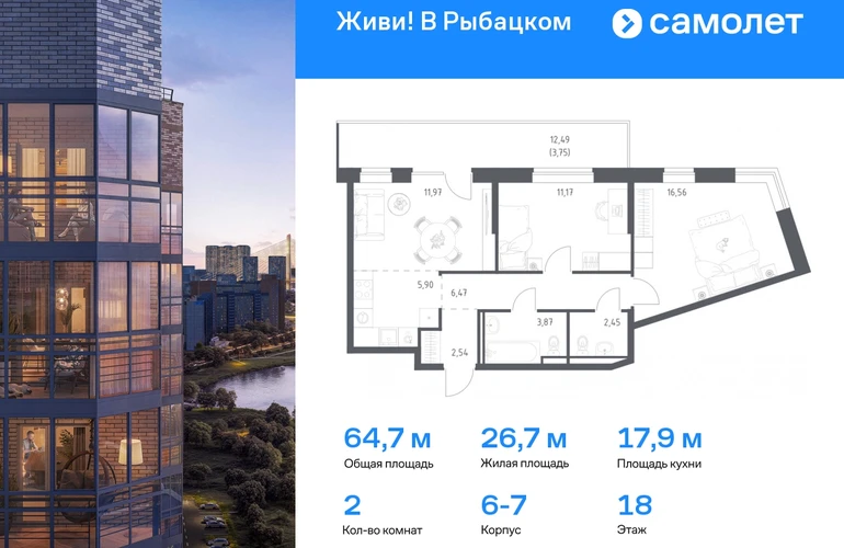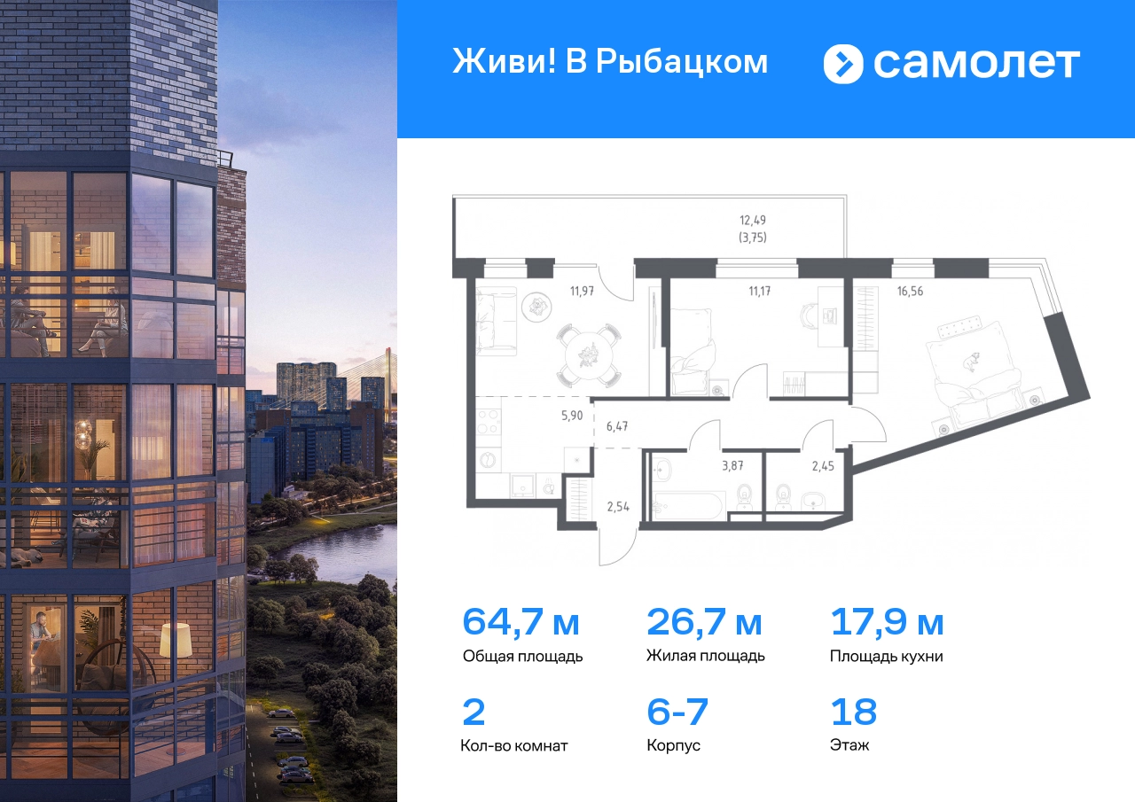 Предлагается 2-комнатная квартира комфорт-класса 64,68 кв.м в корпусе 6-7 на 18 этаже, в ЖК «Живи! В Рыбацком» Квартира без отделки. Доступность опции «отделка» и возможность комплектации мебелью и декором уточняйте у застройщика. Приобрести квартиру возможно по специальным акциям от застройщика, с текущими условиями акций можно ознакомиться в блоке «Акций». Цена динамическая и может отличаться, уточняйте актуальность у застройщика. Квартал «Живи! В Рыбацком» в Невском районе Санкт-Петербурга расположен рядом с рекой Славянкой и парком. Всего 20 минут пешей прогулки — и вы у метро «Рыбацкое». Автомобилисты будут добираться до КАДа за десять минут. В квартале работают два детских сада, школа и кабинет врача. На первых этажах зданий открыты магазины, кафе и салоны красоты. Во дворе — зеленые бульвары, воркаут-площадка, спортивный и игровой кластеры. Для машин — подземный паркинг. Кирпично-монолитные дома с каменной облицовкой — воплощение долговечности и тепла. Есть в квартале и камерный 30-й корпус, в нем восемь этажей, 70 квартир и приватный двор-парк. В сквозных парадных — безбарьерная среда, помещения для хранения колясок и велосипедов и система видеонаблюдения. #yan19-2r1810596#О застройщике
