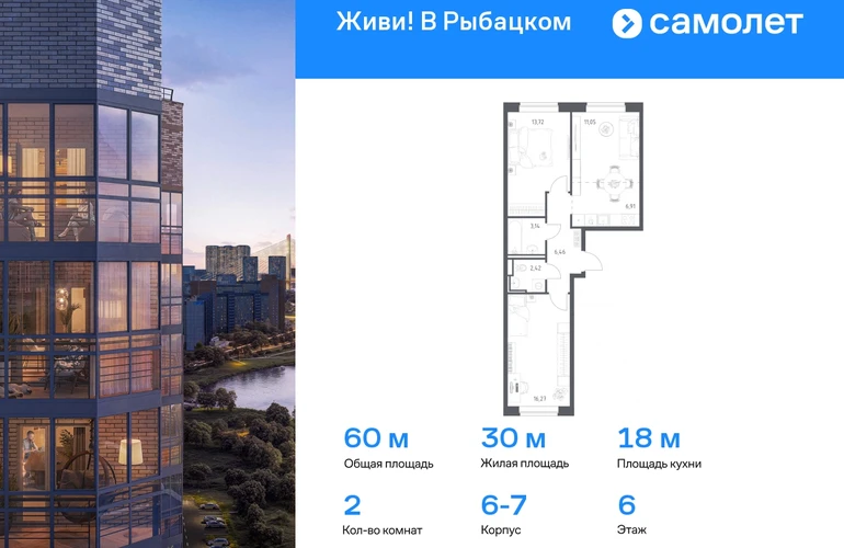 Предлагается 2-комнатная квартира комфорт-класса 59,97 кв.м в корпусе 6-7 на 6 этаже, в ЖК «Живи! В Рыбацком» Квартира без отделки. Доступность опции «отделка» и возможность комплектации мебелью и декором уточняйте у застройщика. Приобрести квартиру возможно по специальным акциям от застройщика, с текущими условиями акций можно ознакомиться в блоке «Акций». Цена динамическая и может отличаться, уточняйте актуальность у застройщика. Квартал «Живи! В Рыбацком» в Невском районе Санкт-Петербурга расположен рядом с рекой Славянкой и парком. Всего 20 минут пешей прогулки — и вы у метро «Рыбацкое». Автомобилисты будут добираться до КАДа за десять минут. В квартале работают два детских сада, школа и кабинет врача. На первых этажах зданий открыты магазины, кафе и салоны красоты. Во дворе — зеленые бульвары, воркаут-площадка, спортивный и игровой кластеры. Для машин — подземный паркинг. Кирпично-монолитные дома с каменной облицовкой — воплощение долговечности и тепла. Есть в квартале и камерный 30-й корпус, в нем восемь этажей, 70 квартир и приватный двор-парк. В сквозных парадных — безбарьерная среда, помещения для хранения колясок и велосипедов и система видеонаблюдения. #yan19-2r1810597#О застройщике