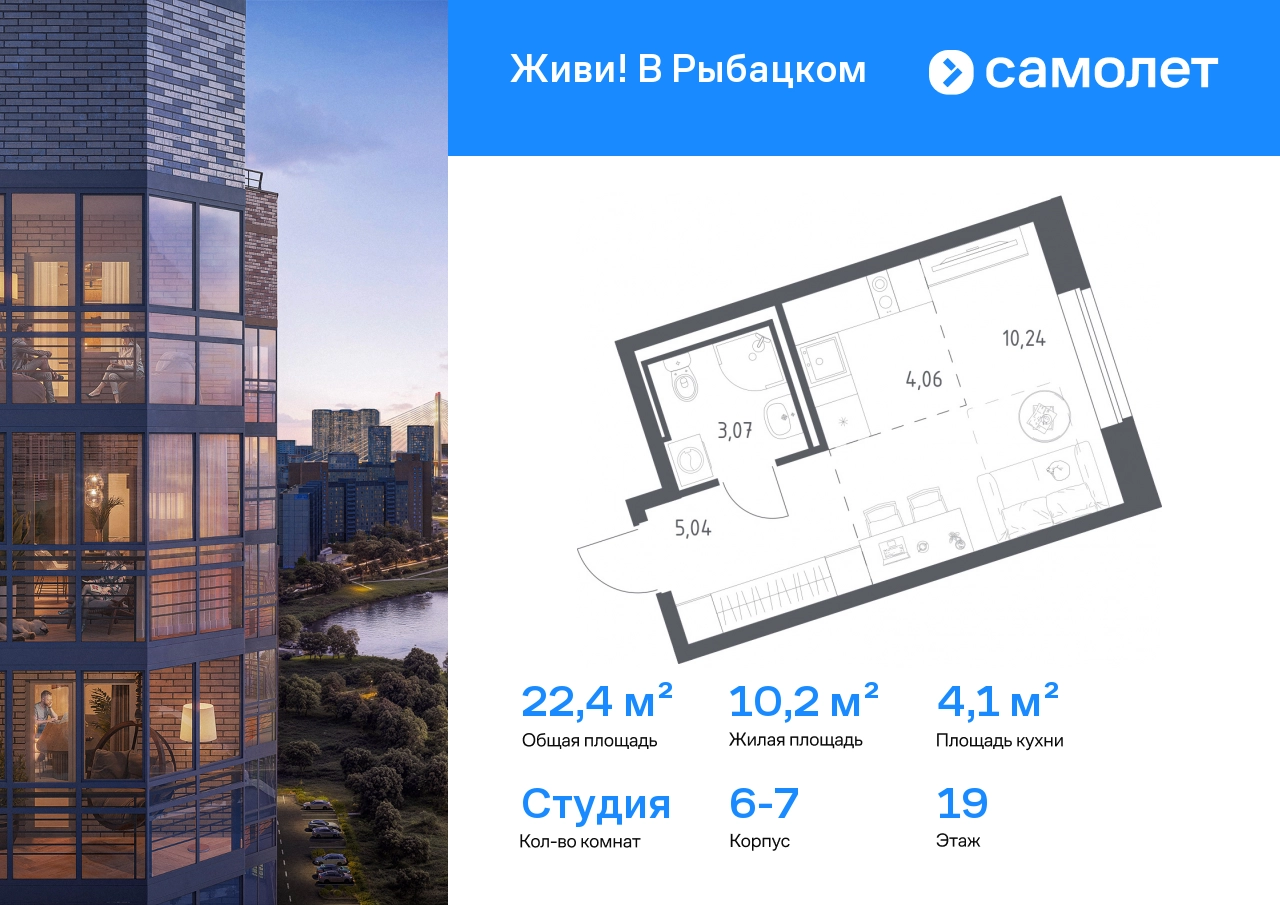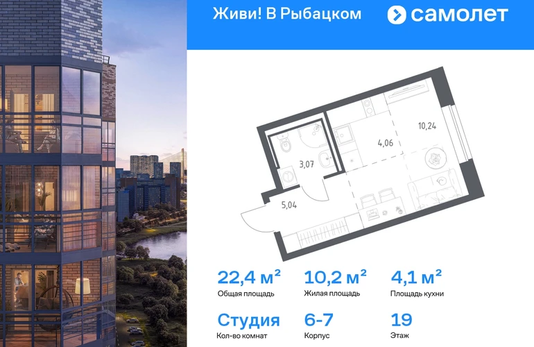 Предлагается квартира студия комфорт-класса 22,41 кв.м в корпусе 6-7 на 19 этаже, в ЖК «Живи! В Рыбацком» Квартира без отделки. Доступность опции «отделка» и возможность комплектации мебелью и декором уточняйте у застройщика. Приобрести квартиру возможно по специальным акциям от застройщика, с текущими условиями акций можно ознакомиться в блоке «Акций». Цена динамическая и может отличаться, уточняйте актуальность у застройщика. Квартал «Живи! В Рыбацком» в Невском районе Санкт-Петербурга расположен рядом с рекой Славянкой и парком. Всего 20 минут пешей прогулки — и вы у метро «Рыбацкое». Автомобилисты будут добираться до КАДа за десять минут. В квартале работают два детских сада, школа и кабинет врача. На первых этажах зданий открыты магазины, кафе и салоны красоты. Во дворе — зеленые бульвары, воркаут-площадка, спортивный и игровой кластеры. Для машин — подземный паркинг. Кирпично-монолитные дома с каменной облицовкой — воплощение долговечности и тепла. Есть в квартале и камерный 30-й корпус, в нем восемь этажей, 70 квартир и приватный двор-парк. В сквозных парадных — безбарьерная среда, помещения для хранения колясок и велосипедов и система видеонаблюдения. #yan19-2r1811109#О застройщике