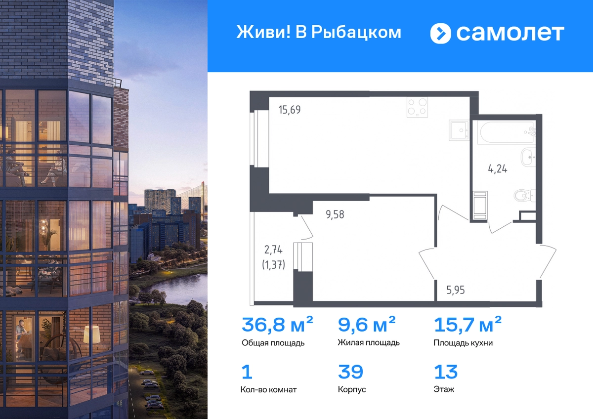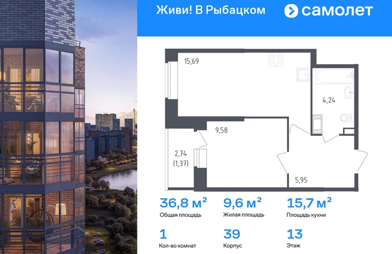 Предлагается 1-комнатная квартира комфорт-класса 36,83 кв.м в корпусе 39 на 13 этаже, в ЖК «Живи! В Рыбацком» Квартира с чистовой отделкой. Доступность дополнительных опций уточняйте у застройщика. Приобрести квартиру возможно по специальным акциям от застройщика, с текущими условиями акций можно ознакомиться в блоке «Акций». Цена динамическая и может отличаться, уточняйте актуальность у застройщика. Квартал «Живи! В Рыбацком» в Невском районе Санкт-Петербурга расположен рядом с рекой Славянкой и парком. Всего 20 минут пешей прогулки — и вы у метро «Рыбацкое». Автомобилисты будут добираться до КАДа за десять минут. В квартале работают два детских сада, школа и кабинет врача. На первых этажах зданий открыты магазины, кафе и салоны красоты. Во дворе — зеленые бульвары, воркаут-площадка, спортивный и игровой кластеры. Для машин — подземный паркинг. Кирпично-монолитные дома с каменной облицовкой — воплощение долговечности и тепла. Есть в квартале и камерный 30-й корпус, в нем восемь этажей, 70 квартир и приватный двор-парк. В сквозных парадных — безбарьерная среда, помещения для хранения колясок и велосипедов и система видеонаблюдения. #yan19-2r1814014#О застройщике